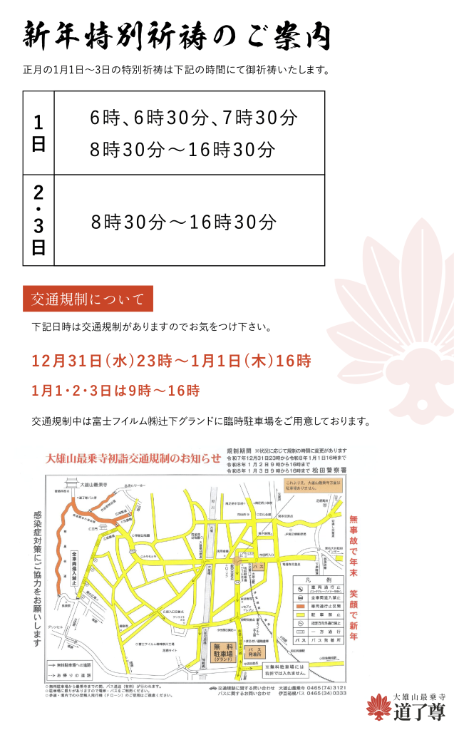 お正月の「特別祈祷の時間、交通規制等」に関するご案内 2025.12.14イベント, お知らせ Post Share RSS イベント, お知らせ 12月15日本堂内への立ち入り禁止のお知らせ 関連記事一覧 【イベント情報】スペシャルツーリングイベントにて「バイク... 喫茶去(お抹茶体験)開催中 【イベント情報】大祭特別行事開催のお知らせ 【イベント情報】喫茶去(お抹茶体験)開催のお知らせ 5/26(日)能登半島復興支援「選んで作れるお守りストラ... 【9/28(日)出店情報】ひとすみ庵 選べるストラップ・... 【イベント情報】ボタニーペインティングのワークショップを... 紅葉ライトアップのお知らせ 天狗のこみちマラソンが開催されました